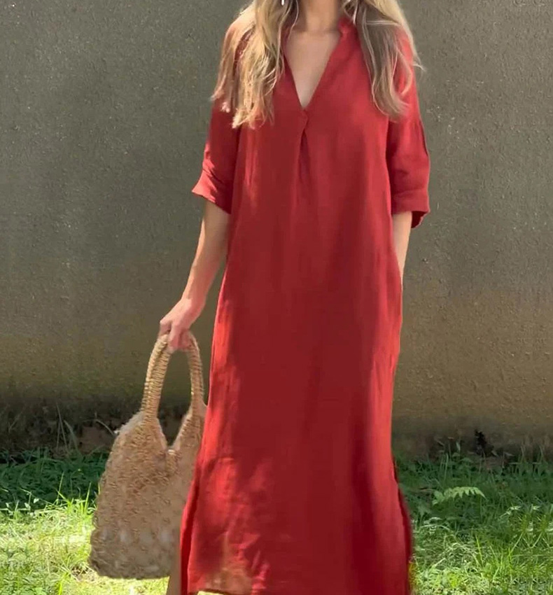 Насладете се на изтънченост с нашата елегантна рокля с V-образно деколте. Тази рокля е изработена с изящни детайли, има ласкаво V-образно деколте и изкусителен разрез на прасеца, което я прави идеална за специални поводи и официални събития.